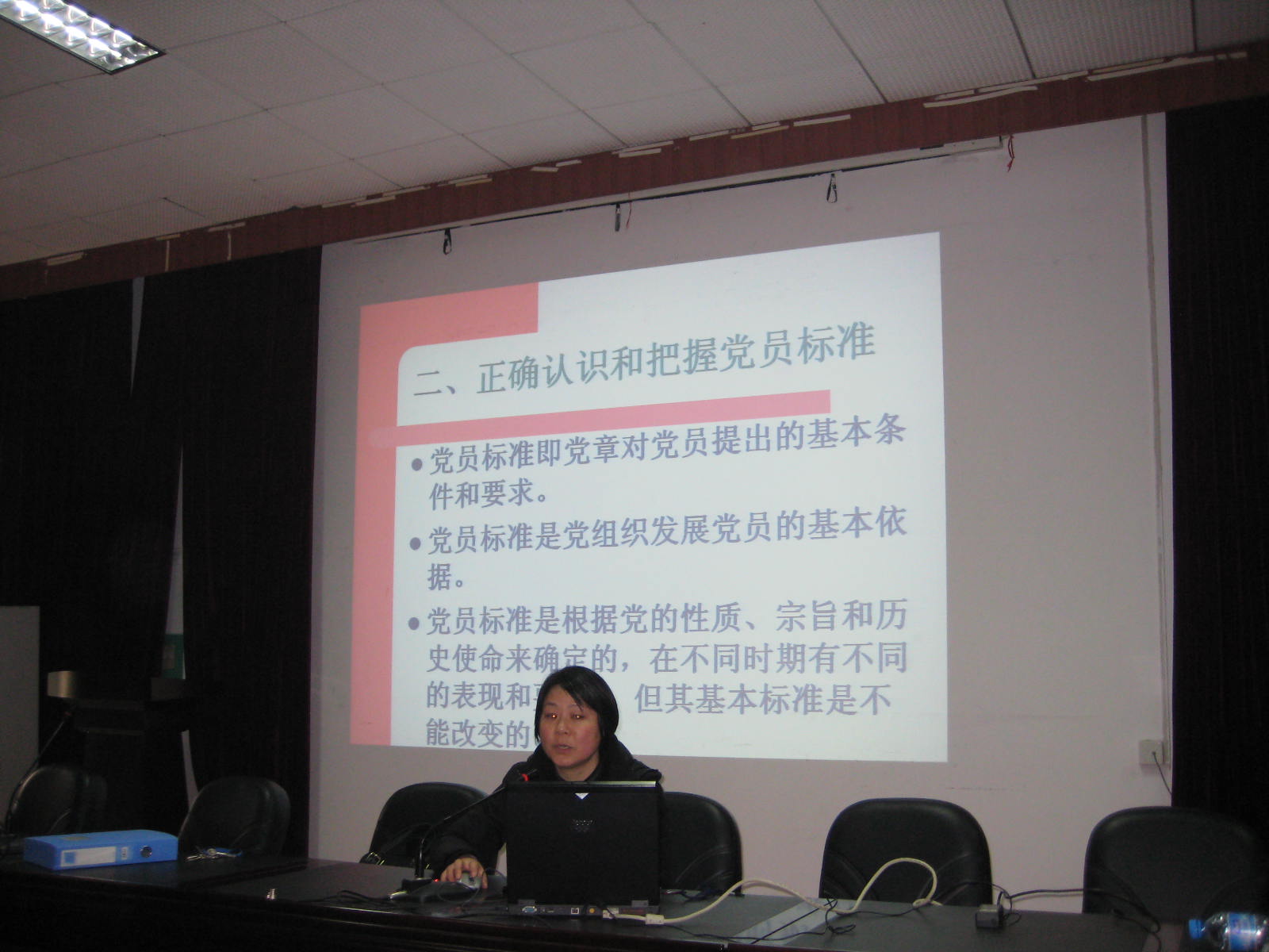 本堂课由本期培训班教务主任龙志纯同志主讲,本堂课的主题是“正确认识和把握党员标准”。龙志纯同志详细地向学员阐述了党章对党员提出的基本条件和要求;再次强调了入党申请书的书写格式和标准;并要求入党积极分子端正入党动机,注重理论的学习,及时找组织汇报谈心,工作中勇挑重担,经得住组织的考验,以实际行动争取早日加入党组织。