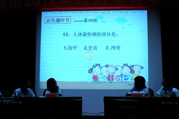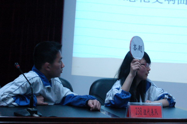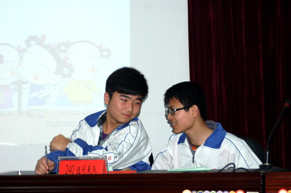 2011年4月13日下午,我校阶梯教室掌声雷动、气氛热烈,由校团委、校心理健康教育中心主办,高一级部协办的第二届“书香校园”读书节之百科知识竞赛决赛在这里举行。本次竞赛初赛在本月8号进行,初赛共选出了237、238、240、246四个优胜班级参加决赛。