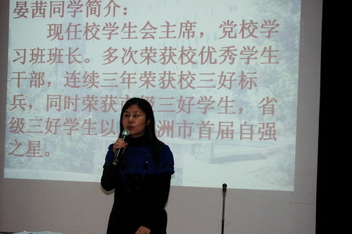 活动最后政教处刘立红副主任作了的精彩点评:非常羡慕在座的学生有《快乐德育15分钟》这样一个栏目,既可以展示自己的才华,又能从别人身上学到宝贵经验,真正实现活动目标:通过学生影响学生,通过学生提高学生。其次是惊叹学生的能力和才艺,从组织策划到节目表演到主持人和被采访的学生嘉宾的落落大方,无不表现出我校学生的人文素养;最后刘主任寄望全体学生积极主动参与到《德育15分钟》活动中来,不断提高自己的综合素质,成为一名全面发展的高中生。
