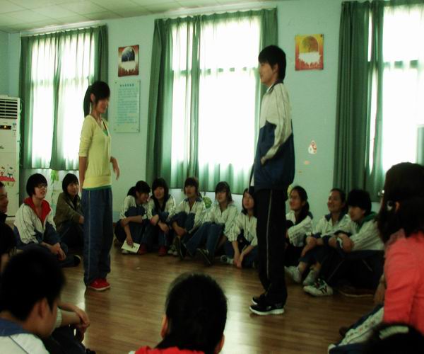 大家都注意到在视频中咨询师和来访者不是我们通常的面对面交流,这时心理老师不失时宜的灌输心理咨询的小知识:心理咨询的时候,咨询师与来访者不是面对面,而是成90度到120度角,为了让大家更直观的理解,这两个同学开始了压力“演习”。