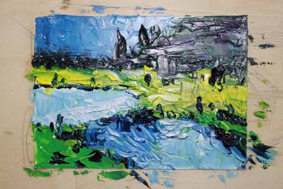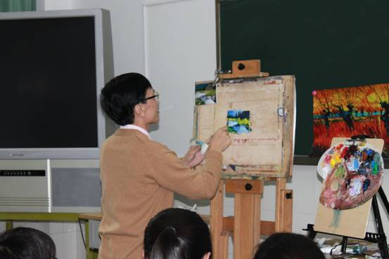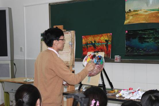 李老师选美术基地五模块(油画、陶艺、创意、书法、国画)中的油画作为传教展示内容,这也是李老师最为擅长的,整节课都给人亲切而厚重的感觉,风趣幽默,形象生动,从撕报纸到用油画刀,从揩拭调色板到挤颜料,从调色到着色,从线条到色彩,从色调到主色,从实摩到虚写,从画里到画外,无不透漏他儒雅的风范和驾轻就熟的手法以及厚积薄发的英姿,他极注重细节,注重美感,更注重人生品德和品位,也许这就是一个从事艺术的人本有的天真!举手投足,举重若轻,总能给人启示,一笑一颦,手足挥洒间总给人知识。听课的学生全身灌注,听课的人也熏陶其中,在他边讲边画边示范中,一幅浓墨重彩的风景画便潇洒完成。这是一堂高雅艺术走进普通课堂的典例,美术基地十八中就是按这种模式对学生进行美的熏陶,提高审美,让每一位学生都带着切合自身的特色走出校门,带着健全的人格走进社会,当这种塔基得到夯实后,那些塔尖肯定会直插云霄。