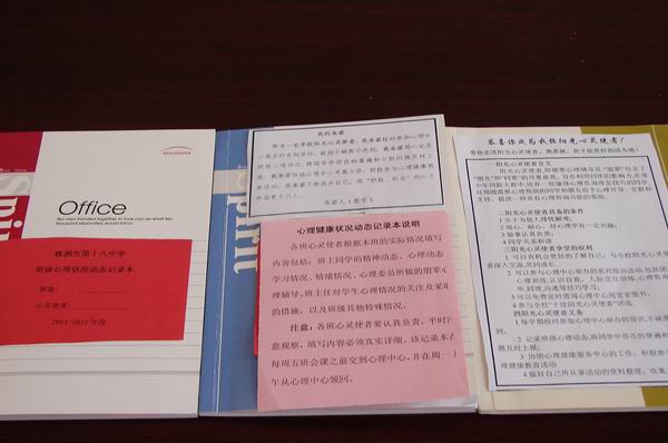 为使心灵使者的工作更加科学化,规范化,本学期心理中心专门制作了“班级心理健康动态记录本”,打开第一页,粘贴了“恭喜你成为阳光心灵使者”及“认识她,你才能更好的成为她”,文字下面是阳光心灵使者的含义,权利,义务介绍。第二页是阳光心灵使者的个人承诺及班级心理健康记录说明。