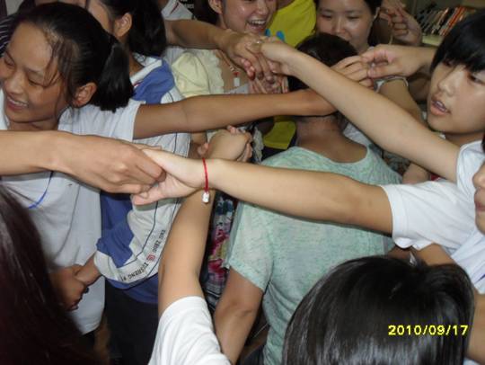 “先不要急,静下心来,内圈的人先蹲下来,我们一起看看‘最大结点’在哪里”,心有千千结游戏中肖艳老师安抚大家焦急的情绪,并想出了办法;“相信自己,通过我们集体的智慧一定可以解开结,前提是不能松手”,主持人也在一旁鼓励道;大家的手紧紧地牵在一起,没有了急躁,埋怨,有的是坚定的信心和智慧的尝试;终于在大家的努力下,心结在慢慢打开,又恢复成了原先的大圆圈,大家不约而同的拍掌祝贺,这掌声里有战胜困难后的自豪,有来自心灵的喜悦。