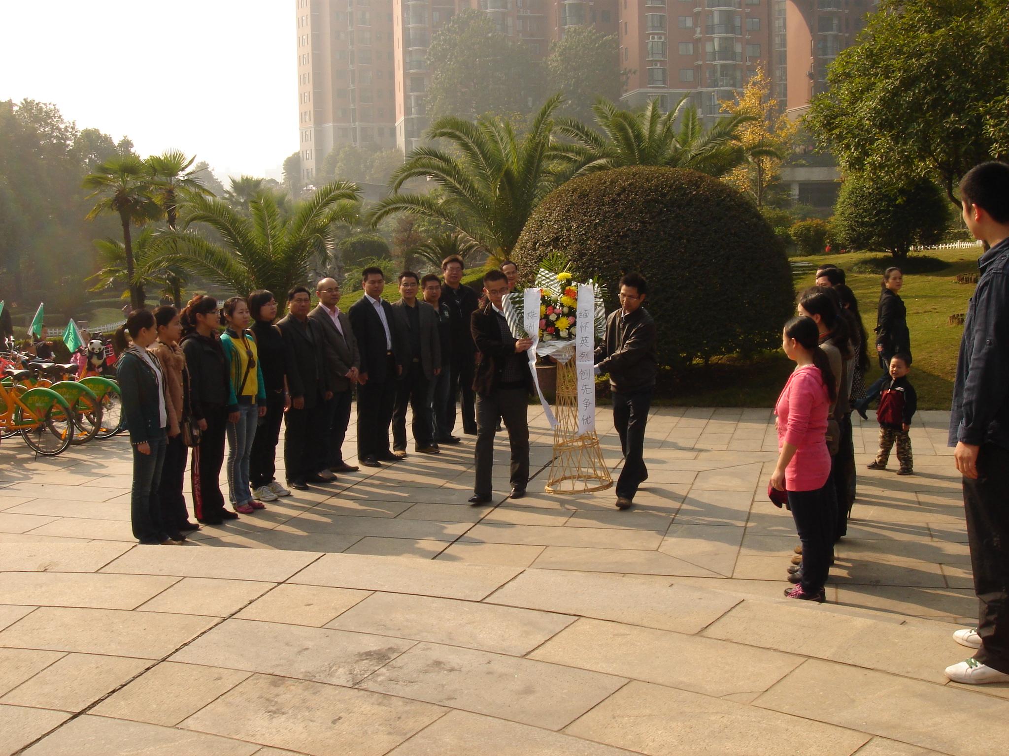 星期日上午的9:40,高三所有的党员以及入党积极分子,还有其他的民主党派人士在流芳园里集合,首先向长眠在流芳园里抗日烈士们进献花篮,缅怀烈士们的英雄事迹,为我们的这次活动拉开了序幕。然后,我们的自行车队伍就向着仙虞岭出发了。