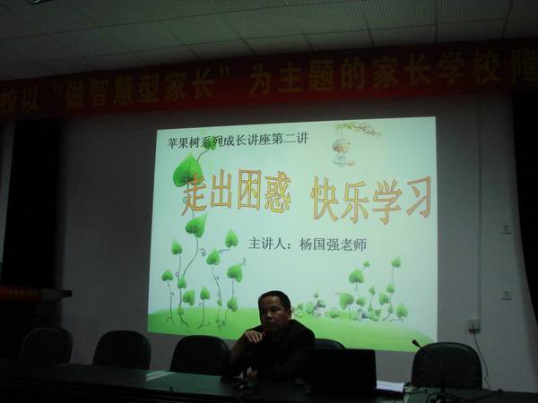 通过杨老师今天的讲座,我再一次感受到了杨老师的沉稳和大气。如果说苹果树第一讲是一场还算热闹开心的烟火的话,杨老师今天关于学习的讲座则是富有营养的暖汤,不急不燥,除人病痛,给人成长。杨老师一直非常重视学生的心理,一直热心参与我校的心育活动,在20多年的班主任工作中形成了自己的教育教学理念,他是一位喜欢思考,善于总结,关注细节,运筹全局的教育干将。每次看到杨老师,心中的敬意总会升起。再次特别感谢杨老师的讲座!