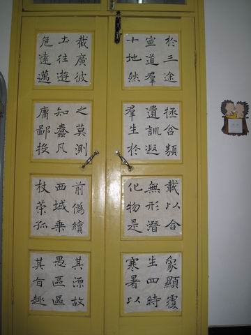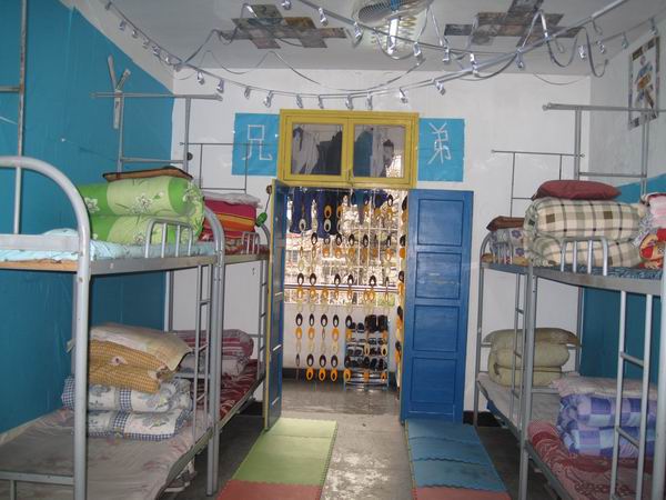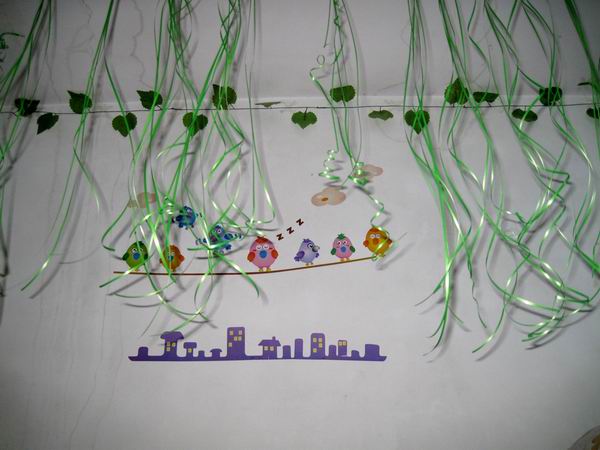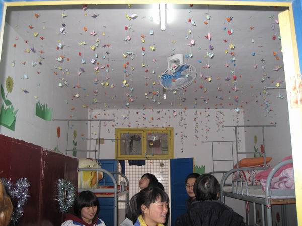 一片片、一张张彩色小纸片承载着孩子们的梦,落在墙上,有星星、月亮、太阳、大海、鱼以及憨态可掬的卡通人物、还有那些不知名的,却有无限魅力的符号图案。一幅幅字体流畅、均匀健美的书法,或浓墨重彩或清新婉约的绘画悬挂于内,每一幅都使整个宿舍充满了深邃、厚重的美。