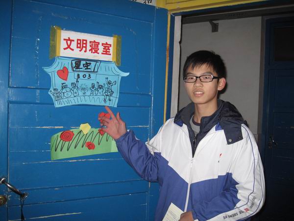 一片光碟有什么用?来到261班男生寝室314室,你会看到神奇。很难想象,男生的宿舍会如此干净整洁,创意与温馨并存。一抬头,蓝色纸飞机组成的“心形”机头与光碟组成的机身格外亮眼,肯定费了不少心思!右边墙壁上手工制作的一个“家”,门上左右两边“兄弟”二字,让你顿时明白,住在这个房间的孩子们之间的情谊。