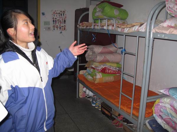 不少宿舍通向阳台的门装上了门帘。一排两排彩色透明,风铃绸缎,随风飘荡。床,被褥整齐。布娃娃,小熊,大狗歪着脑袋斜着眼地看着进门的每一个人。床沿挂着、贴着真真假假的绿叶,蜿蜒、盘旋,似乎正牵连着一片小小的绿色天地,引人遐想。