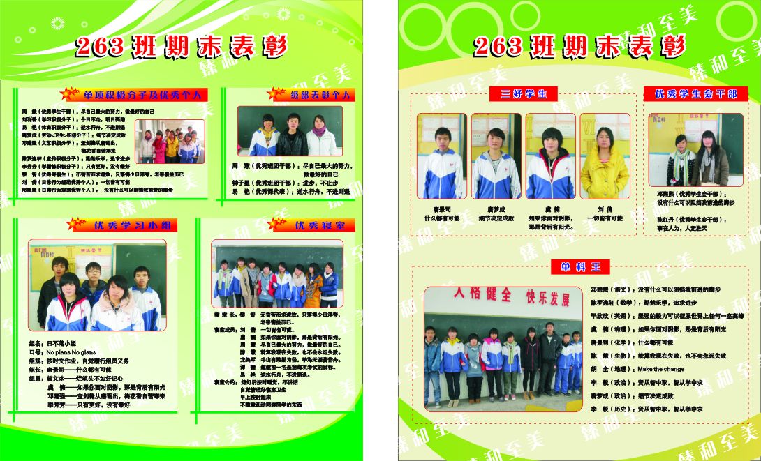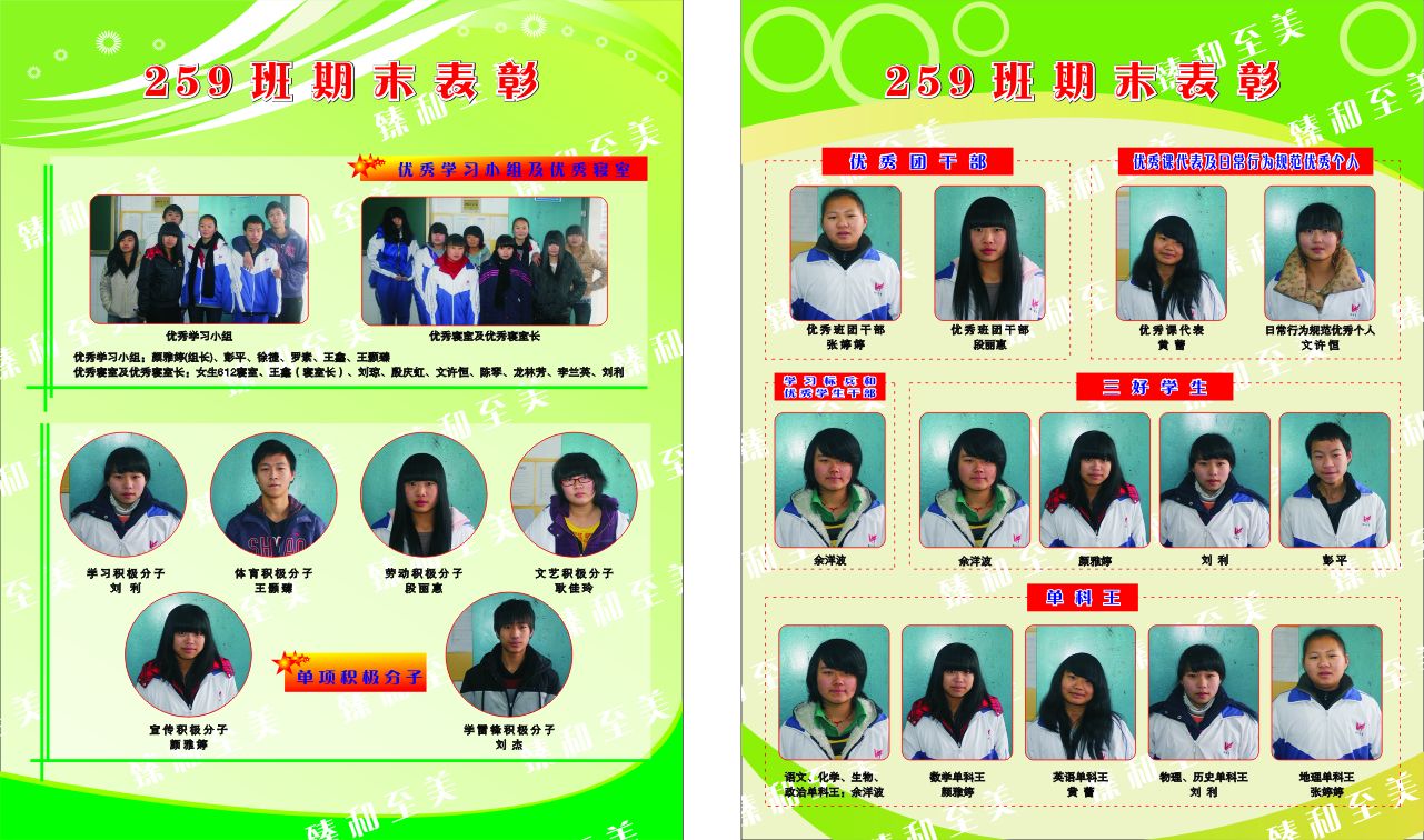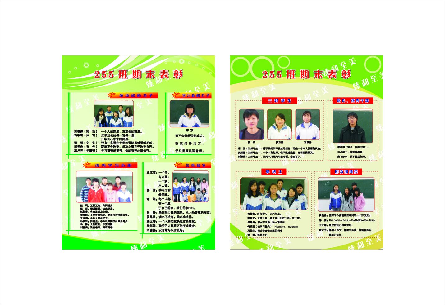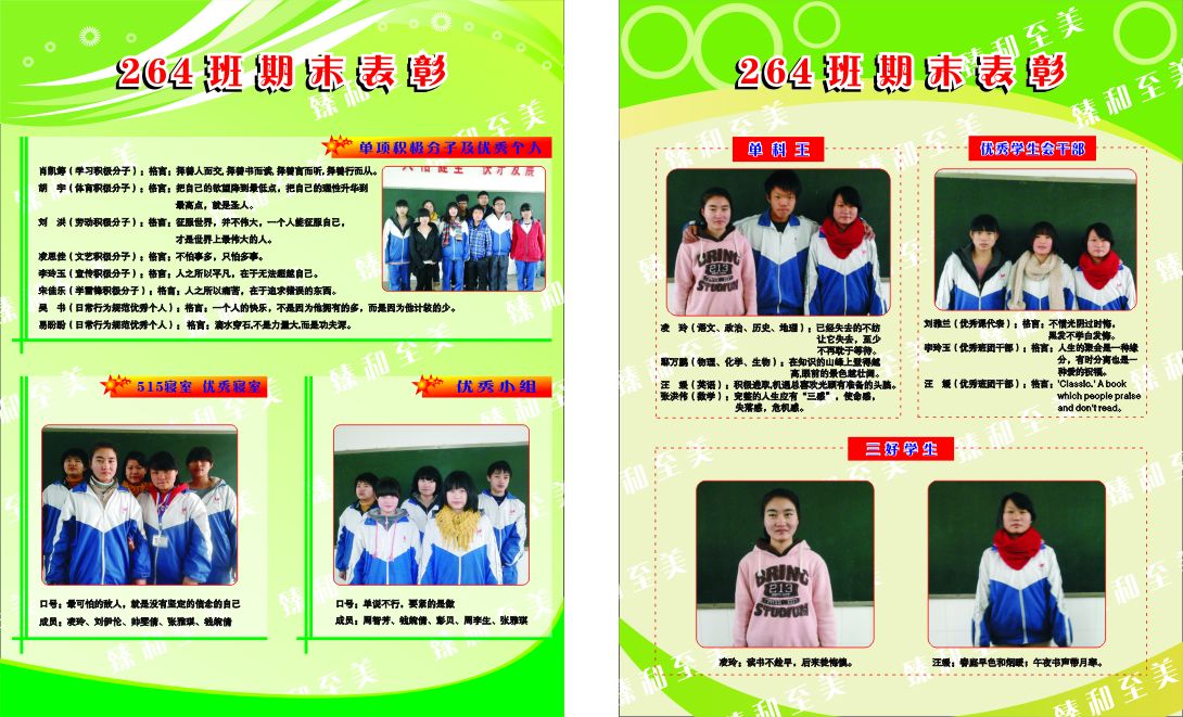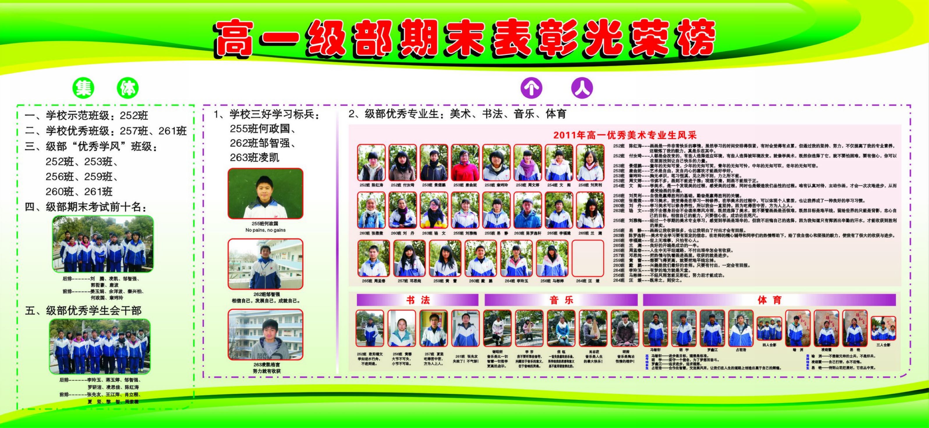 新的学期开始了,为表扬先进,激发同学们在新的学期里潜能,增强同学们的信心,级部把去年下学期同学们获得的各项奖励,如:学校示范班级,学校优秀班级,学校三好学生标兵,学校三好学生,学校优秀干部,学习成绩前十强,各项积极分子等绘制成图,以光荣榜的形式张贴在学校的显眼处,以资鼓励,希望同学们再接再厉,再创辉煌.