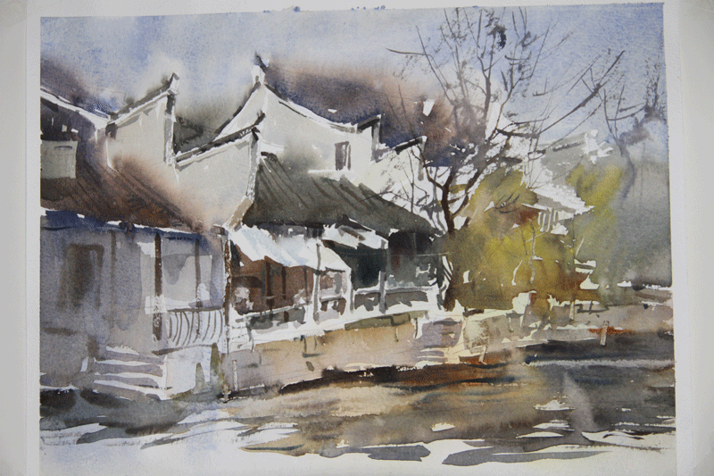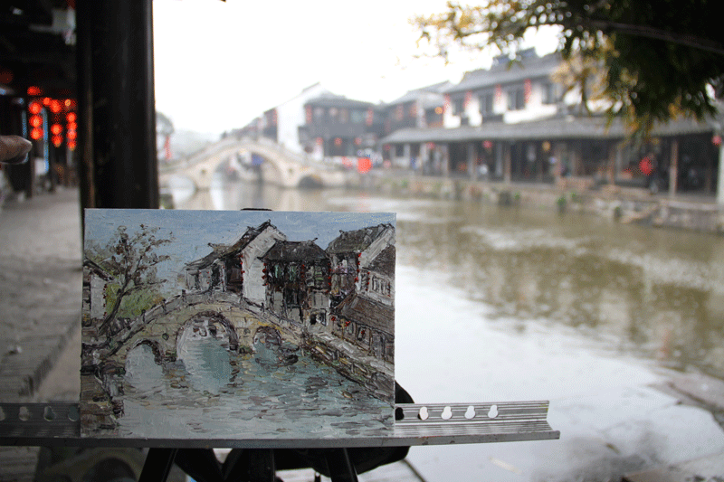 中餐口味一般,带的湖南萝卜辣椒一扫而光。上午还是阴天,下午就刮风下雨,寒气逼人,我们有点后悔没穿得棉袄。当然,这也挡不住我们对西塘古镇的爱恋之情,备好画具颜料,带上雨伞,直奔选好的写生地点。我们在烟雨长廊边架起画具,开始了“西塘处女作”。灰蓝色的天空、斑斓的小河、古朴的石拱桥、岸边林立的民居、刚透点绿的零星树木,一幅冷色调的烟雨迷蒙的江南风景呈现在眼前。三个多小时一晃而过,饱经风雨的我们一个个冷得直打哆嗦,鼻涕直流。好久没有外出风景写生,技艺略显生疏,看着不太成熟的“处女作”,虽腰有点酸,腿有点疼,心里还是略感满足。
