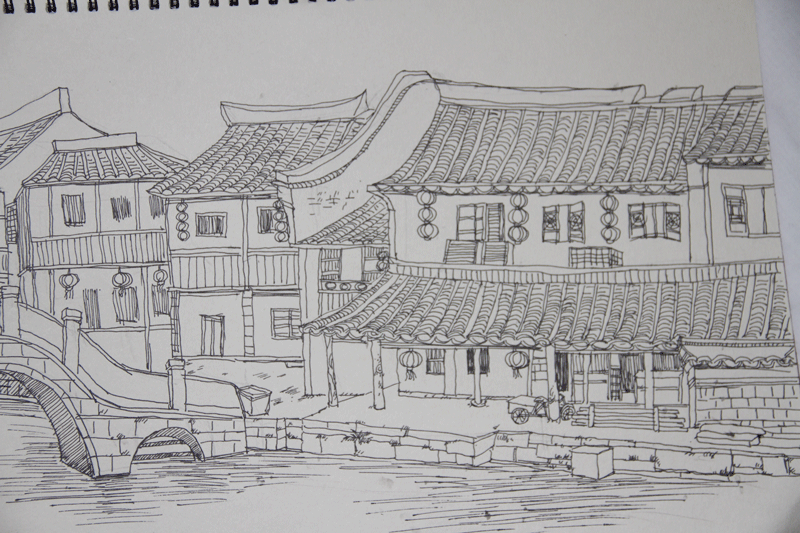 在一个条件简陋的宾馆安顿好后,我们不顾一身疲惫,就投入了西塘古镇核心景区的怀抱。上午任务是“踩点”,选好适合写生的地点。西塘古镇确实名不虚传,江南特色民居古建筑保存完好,斑驳的大理石街面,白墙灰瓦,小桥流水,小红灯笼高高挂,仿佛带我们进入了一个遥远的时代。