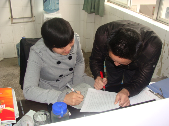 图为骨干班主任郭纪要老师与年轻班主任易洁老师一起在做特困学生的思想工作。