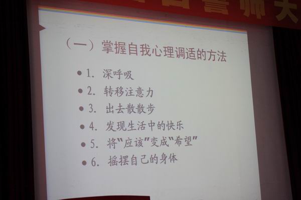 罗志强老师还特别分享了东北师范大学教育科学学院博士生导师,华东师大心理学博士后刘晓明教授主讲的《关注班主任的心理成长》。通常关于如何做一个好班主任的指导很多,而关于班主任心理成长的少。罗老师现场还给全体班主任做了《紧张压力自我诊断》的测试,不少班主任笑着惊呼都有,都有,看来压力还真不少!此外,罗老师还分享了新学到的一些自我心理调适的方法,如将“应该”变成“希望”,摇摆自己的身体,班主任们可以实践操作,调适身心。