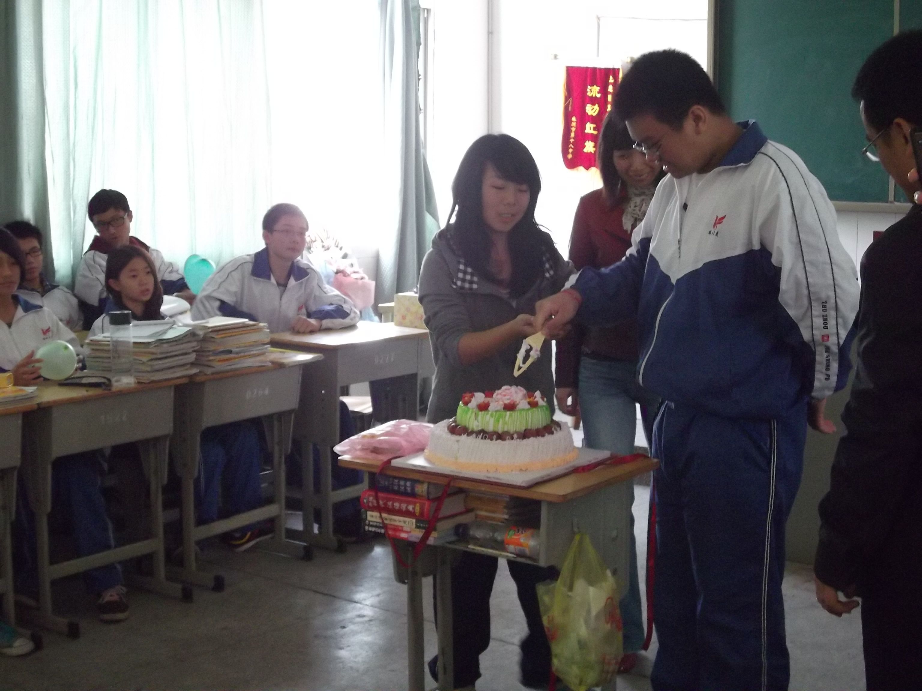 班主任贾小红老师接过凌益洲的生日蛋糕露出了甜蜜的微笑