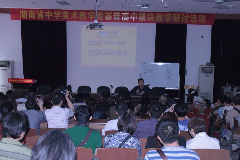 热烈而意义深远的湖南省中学美术教学竞赛暨高中模块教学研讨活动于5月16日在十八中胜利落下帷幕。此次活动是由湖南省教科院主办,株洲教科院、株洲十八中承办,在十八中进行的一次全省的第一次规模宏大的美术教研活动。活动时间为5月13日到5月16日,有14个地州市参加,参加有各地州市的美术教研员和各校美术教师精英共计200多人。