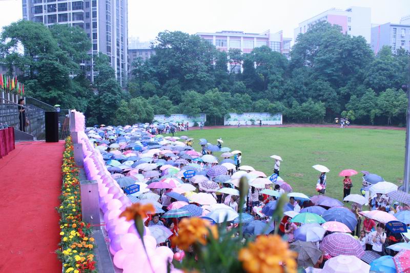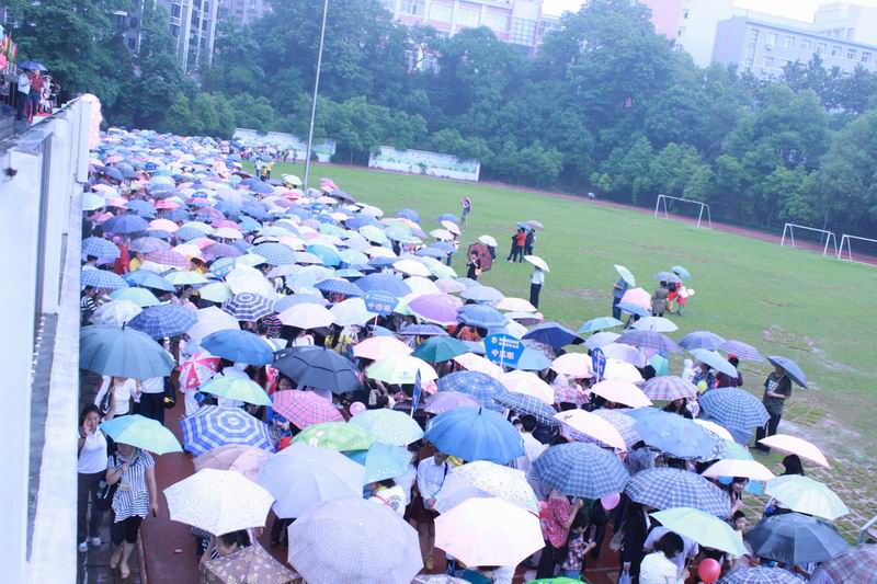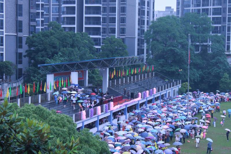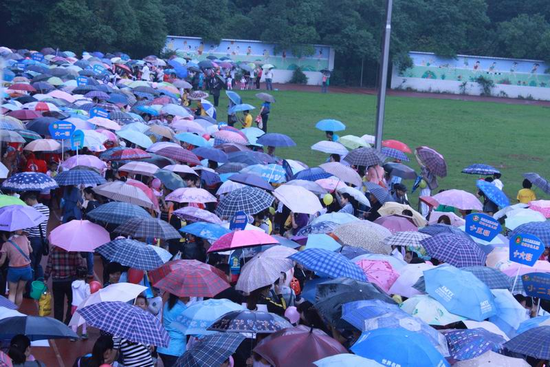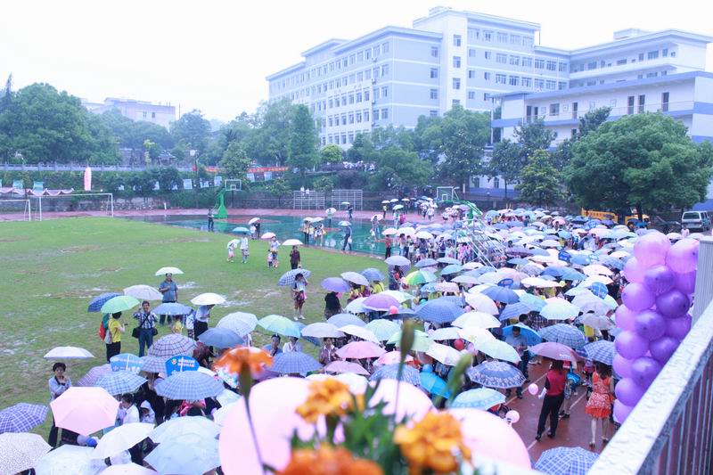 是日,夏雨倾盆,并没有淋湿孩子、老师、家长的热情,真可谓“雨中情真,伞下意切”漫天飞舞的气球,遮天斑斓的雨伞,活泼绚烂的彩旗,和着这菲菲的雨,一个童话般的盛典哗然走来。孩子们穿上节日盛装,在摩肩接踵的家长蔽日的伞下快乐的笑着跳着,大有仗彩笔走天涯的俊朗之气,更有少年英雄华山论剑的风范。
