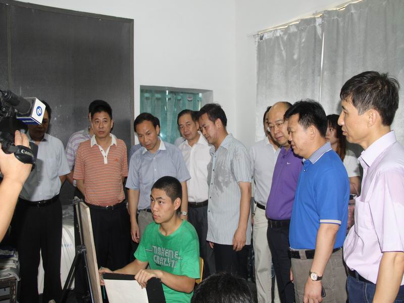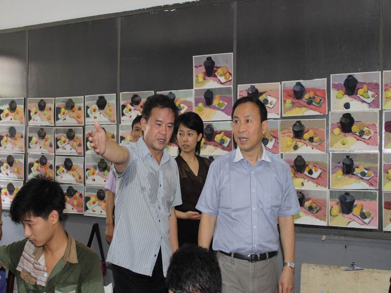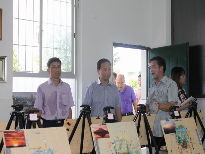 烈日炎炎,沁人心脾的清风徐徐。陈君文书记一行先后参观了学校的美术楼、美术展厅、油画模块室、陶艺模块室、书法模块室以及学校校园环境。陈君文书记对学校的美术生的培训很感兴趣。在培训现场,陈君文书记时而凝神静气的观看学生的运笔;时而含笑学生构图的线条;时而略有所思地观赏作画的起势。在展厅,陈君文书记更是目光如炬,看到众多的作品喜形于色,高兴的说:“就是要彰显师生的智慧,才是特色发展的内蕴”,并亲切询问这些作品的作者去向。在参观学校的模块室和学校校园环境时,君文书记一直不停颔首。整洁的校园尽管没有琅琅的读书声音,但绿荫里蝉歌阵阵,深树中鸟语声声,更有此时的欢歌笑语。