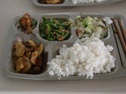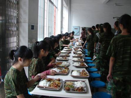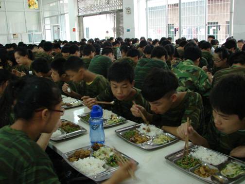 学生在教官的带领下有序来带学校食堂 同学们依次就坐吃饭 来个特写,还挺丰盛的 根据教官的要求,吃饭的时候不能讲话