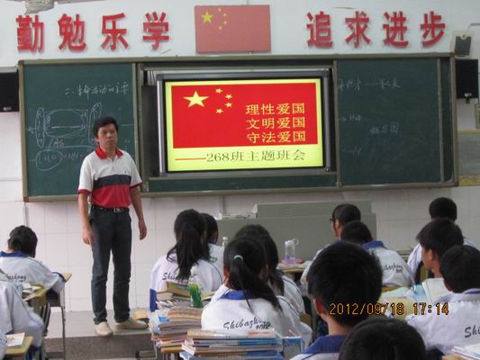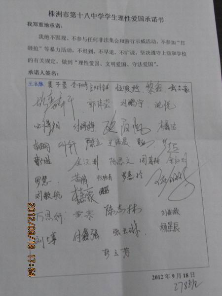 为了教育学生理性爱国、文明爱国、守法爱国,周二下午第九节课,高一各班举行主题班会。同学们在班会上庄严宣誓:理性爱国!并在承诺书上郑重签字。