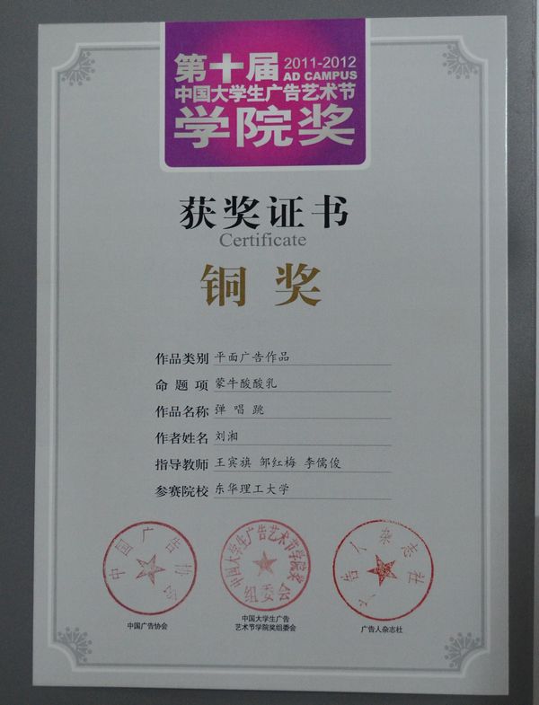 后来得知,这个全国大奖是由中国广告协会主办、《广告人》杂志社承办的以“我创意 我行动”为主题的““2011-2012第十届中国大学生广告艺术节学院奖”。他参赛的作品是由蒙牛酸酸乳企业命题的平面广告设计:《弹》《唱》《跳》在来自全国1000多所高校院系提交的71000余件作品中脱颖而出,最终获得铜奖。本届学院奖共设置包含平面广告、影视广告、网络flash(含微电影)、广告策划书、广告文案、论文以及公益广告、UI设计等8大类的奖项。经过来自全国高校广告教育专业教授、知名广告公司创意大师、知名企业营销广告专家的反复筛选和评判,共评出等级奖139个,其中铜奖作品75个,银奖作品44个,金奖作品19个,全场大奖1个,评委推荐特别大奖1个。