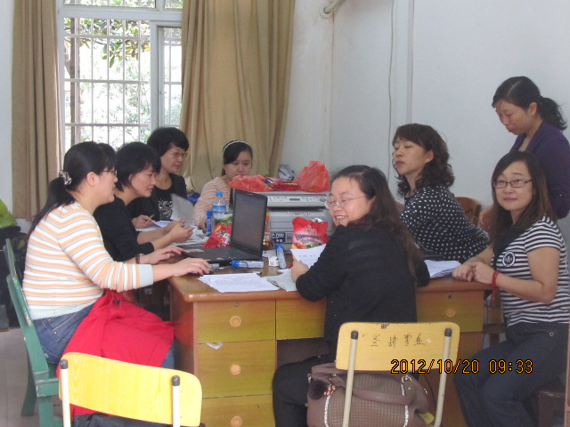 有人说“编排记录室”是整个运动会的心脏,此话不假,一语道破了它的重要性。开赛以来,各项成绩源源不断地涌进“编排记录室”,让人没有片刻喘息的时间。“编排记录室”的头儿唐霞把全体成员分成三大组,有条不紊地指挥大家计分、统分、登分。指挥员简洁的吩咐,电脑打字的啪啪声,埋头书写的沙沙声,似乎是说这里的编排静悄悄。看,黄焱琳和谢桂仙两位信息老师这几天晚上连续在教务科加班工作到深夜,白天又在“编排记录室”忙碌,尽管脸色苍白但一样斗志昂扬;刘晖和李许兰两位美女老师工作时踏实肯干,专注的神情一样秀丽无比;可爱的冯静和持重的谭雄姿相映成趣,配合默契;头儿唐霞身先士卒,指挥若定;亮丽的胡樱跑里跑外,张贴成绩,忙得不亦乐乎…这是一个多么团结,充满战斗力的团体!这里似乎又是热闹的:不必说李国柱校长三番视察,谭水生科长五次问候;也不必说刘加生科长亲自“督战”,晏裕总裁判长多次垂询;单是联络员雷小雨老师,裁判员邓桂强老师汗涔涔,急如星火地传送各项比赛成绩都让人感觉“编排记录室”是机要重地,硝烟弥漫。而八名女老师则在此展现了她们超强的战斗力和飒爽的英姿。
