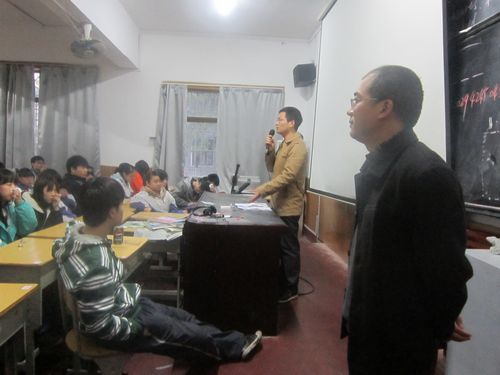 欧阳九生科长发言,首先分析了目前高三美术生学习的具体情况(早上七点开始专业训练、晚上十一点结束),认为高三美术特长生能吃苦耐劳,一定能在不久到来的联考中取得好成绩,但就在整日钻研专业的情况下,仍要重视合理安排学习时间,处理好学习与生活中的问题,如寢室卫生、出校规定等等,这样才能不受外界干扰更好地学习。