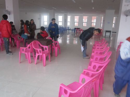 报名后学生随即到楼上找到自己的考室,根据自己的座位号进行考试情况的分析。刘三江老师在考室对模特可能的造型进行了预测和示范。