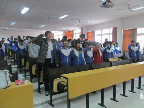 仪式在洋溢着青春气息的共青团团歌中拉开序幕,大会主持人余洋波同学首先宣读了批准入团新团员名单,86名新团员在与会人员的见证下光荣的加入了中国共产主义青年团。景煜鹏同学代表老团员领誓,全体新团员面对鲜艳团旗,举起右手庄严宣誓:“我志愿加入中国共产主义青年团,……为共产主义而奋斗。”洪亮地青春誓言表达了同学们对共青团组织的无限向往和豪迈激情,赵红歆秀同学代表全体新团员表达决心。简短、庄重、热烈的宣誓仪式,使同学经历了一次心灵的洗礼,一次严肃而庄重的爱国主义教育,增强了青年团员的使命感和责任感,强化了集体主义观念和为他人服务意识。