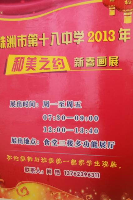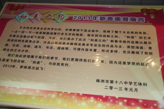 为了庆祝2013年新春的到来,丰富师生课余生活,营造浓郁的学校文化氛围,积极展现我校学生的书画才能,株洲市十八中学艺体科、美术教研组共同举办的“和美之约”新春书画展于2013年1月14日在我校食堂三楼多功能展厅举行。这次画展是株洲市十八2012年度艺术节的一部分。