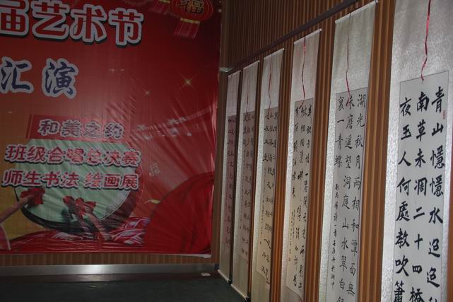 此次展出的书画作品都是出自我校教师和学生之手。绘画作品主题鲜明,风格多样,意境深邃。庄重凝练,飘逸挥洒,既体现了同学们扎实的基本功和创作才能,又体现了广大学生巨大的绘画潜能,充满清新和灵动之气。书法作品字体方正、起落圆实、行笔平匀、转折和缓、遒劲有力,一幅幅墨宝像一个个音符,奏响中华民族五千年文明的绝响。本次书画展参与广泛,作品数量多、质量高,是我校素质教育成果的一次大检阅,对我校特色办学起到了积极的推动作用。同学们高超的书法绘画才能充分体现了我校重视特色教学,注重学生文化艺术特长的培养,更展示了我校艺术文化的底蕴。
