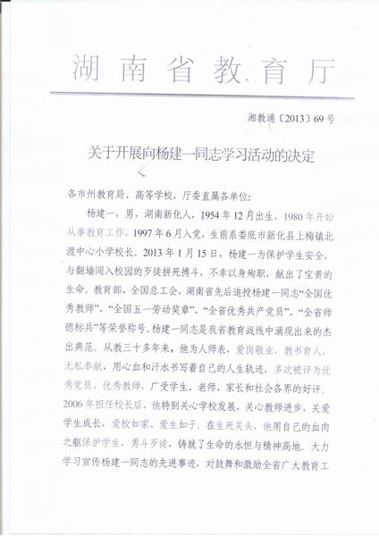 关于开展向杨建一同志学习的决定