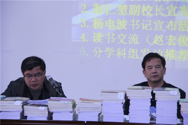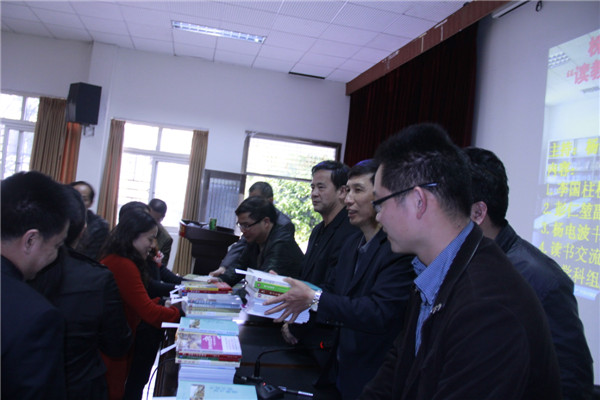 最后,在激昂的凯旋进行曲中,各学习小组负责人代表本组上台接受校领导赠书。启动式圆满结束,全年读书活动拉开序幕。