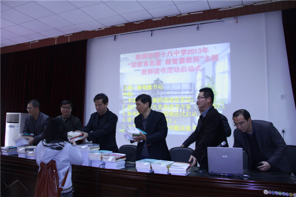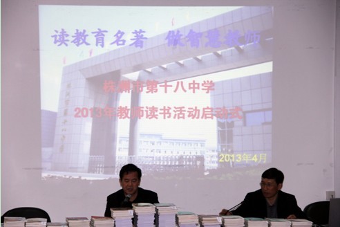 4月8日,株洲市十八中“读教育名著,做智慧教师” 2013年教师读书活动高调启动。下午四点,该校全体教职工齐聚一堂,在多媒体教室举办了隆重而又简朴的读书活动启动式。会场没有悬挂横幅,会标使用多媒体图片展示;没有摆放鲜花,取而代之的是一堆堆的教师阅读书籍和读书笔记本,整个会场洋溢着浓浓的书香氛围。