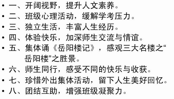 据悉,为了更鲜活的发动宣传,十八中学生科召开科室成员专门会议,进行布置安排,发放告家长书,制作PPT,由班主任在各班统一进行宣讲发动,精美的图片配以简要的文字,吸引人心,学生科饶鹤龄科长还总结了去岳阳的八大理由,从人生经历、素养能力、人际情感等多方面激发学生的兴趣,提升参与度。