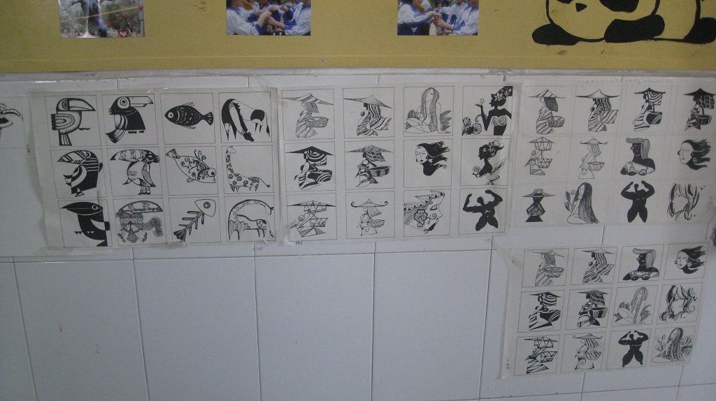 267班教室后面贴满了学生的艺术作品。