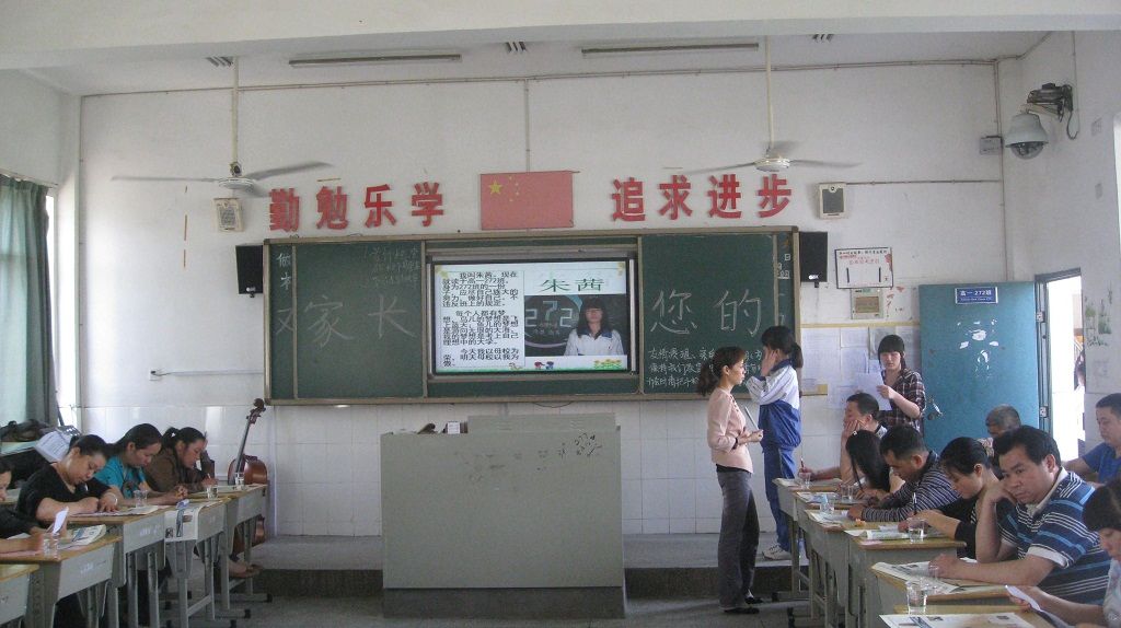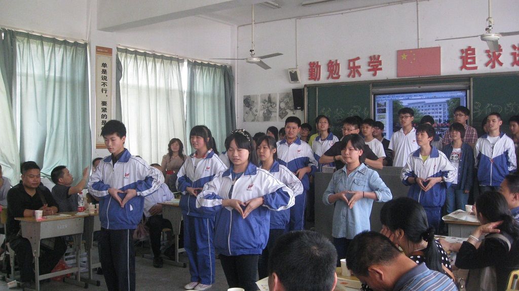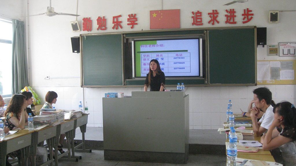 268班胡耀芳老师要求全体学生陪听家长会,静听美术老师罗忠老师分析学生的学习情况。