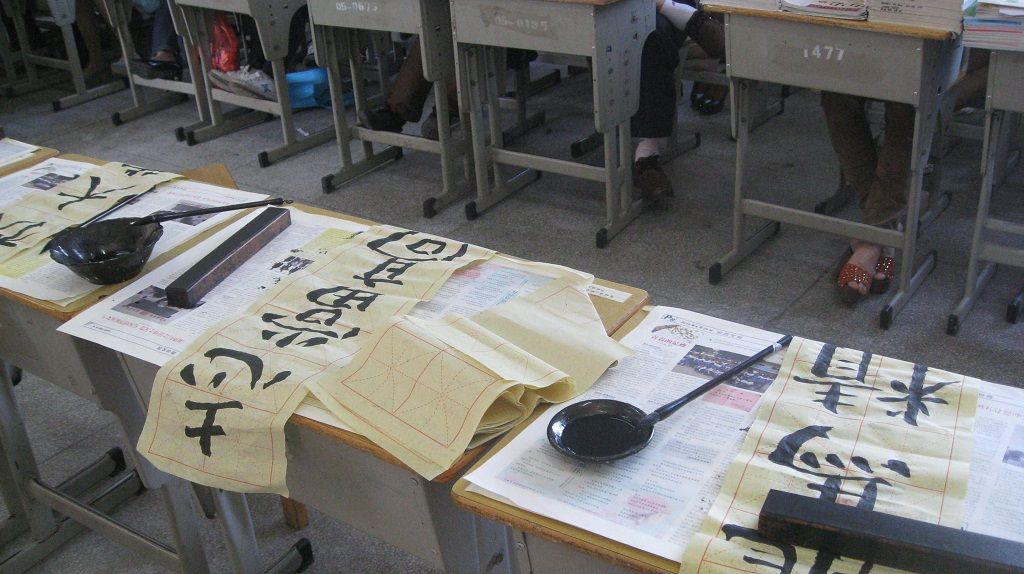 274班,桌上摆上了学生自己的书法作品。