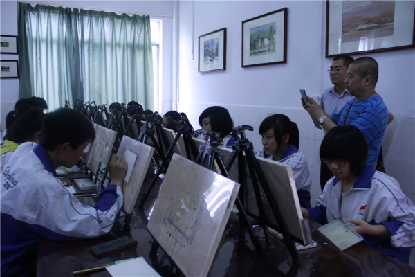 14日下午,由十八中李志华副校长主持活动的第三部分——美术特色学校建设研讨。十八中校领导及美术特色教育课题组的成员陪同尹少淳教授、省美术教研员朱小林以及市美术学会理事会全体成员观摩了我校的美术模块教学,李国柱校长向各位专家介绍我校美术特色教育课题研究、美术特色学校建设、美术学科基地建设、美术模块教学、美术专业培训等各方面工作的情况,在随后的座谈会上,各位专家和领导对我校的美术特色教育赞不绝口,并提出很多建设性意见,它山之石,可以攻玉,专家领导们的建议必将帮助十八中将美术特色教育做大做强,成为株洲市美术教育的擎天之柱。