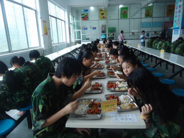 笔者注意到,中餐的时候,一对中年夫妻从学校食堂往外走,脸上带着放心满意的笑容,回头一看,在老师和教官的安排下,孩子们在食堂谨然有序,美味的享受着准备好的午餐。