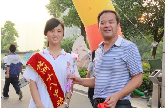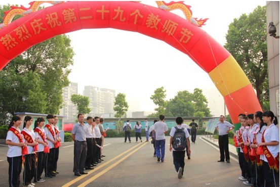 这时她才回过神来,抬头看见两龙腾飞的气拱门上赫然印着“热烈庆祝第二十九个教师节”的金光大字,与朝阳齐飞,与巍峨的校门辉映,两旁站立整齐身着校服身披“株洲市第十八中学”绶带的学生每人手捧鲜花和一个红红的小礼品盒。