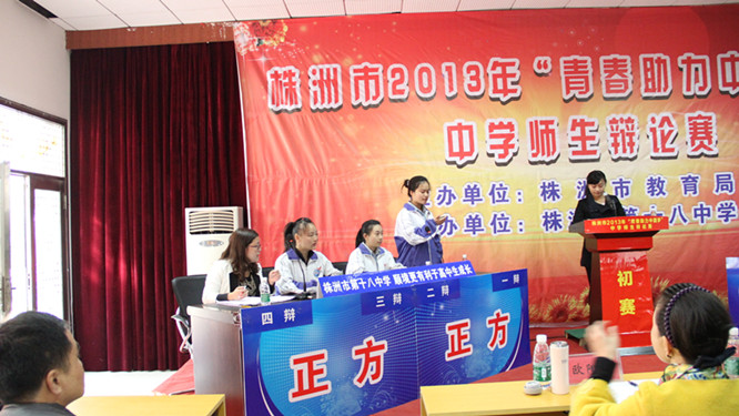 2013年11月30日上午8:30,在株洲市十八中多媒体教室株洲市第十八中学代表队和第十三中学代表队进行了一场精彩的辩论赛。辩论赛的题目是:顺境更有利于高中生的成长还是逆境更有利于高中生的成长。对战双方选手实力可谓伯仲之间,整个过程相当精彩,经过激烈交锋之后我方取胜杀入半决赛。