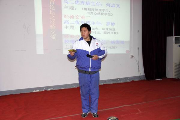 德育论坛结束后,党委杨电波书记宣布2013年下学期优秀班主任、示范班级、德育论文、心理论文、德育短语短论获奖情况。获得示范班级的正、副班主任双双上台领奖。最后李国柱校长发表了总结讲话。