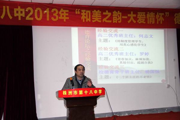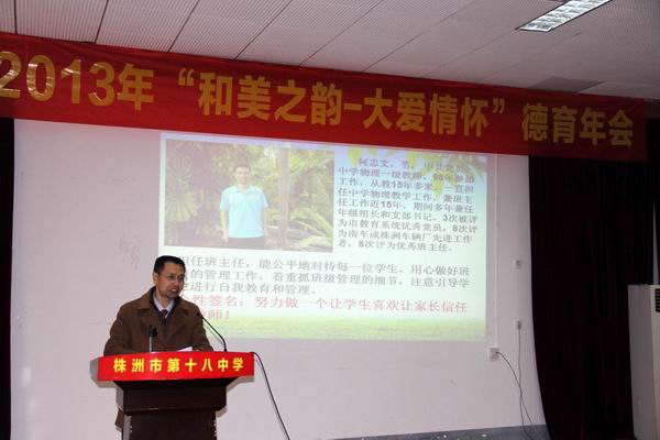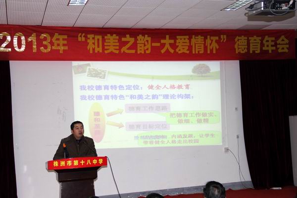 2013年12月22日,株洲市第十八中学“和美之韵—大爱情怀”第五届德育年会圆满结束。李国柱校长、杨电波书记,彭仁堃副校长,李丰源副校长,欧林奇副校长、彭泽波主席及学校所有中层干部,学校正、副班主任,学生科全体成员,出席了会议。