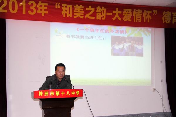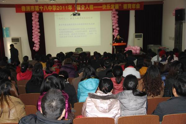 株洲市十八中德育年会独具特色,一年一个主题,2009年“心理健康教育”,2010年 “快乐德育—寻乐求美”,2011年 “健全人格-快乐发展”,2012年则是 “和美之韵—责任品质”。2013年”和美之韵-大爱情怀“,每一届年会都持续一个月,形式多样,内容丰富,具有实效。