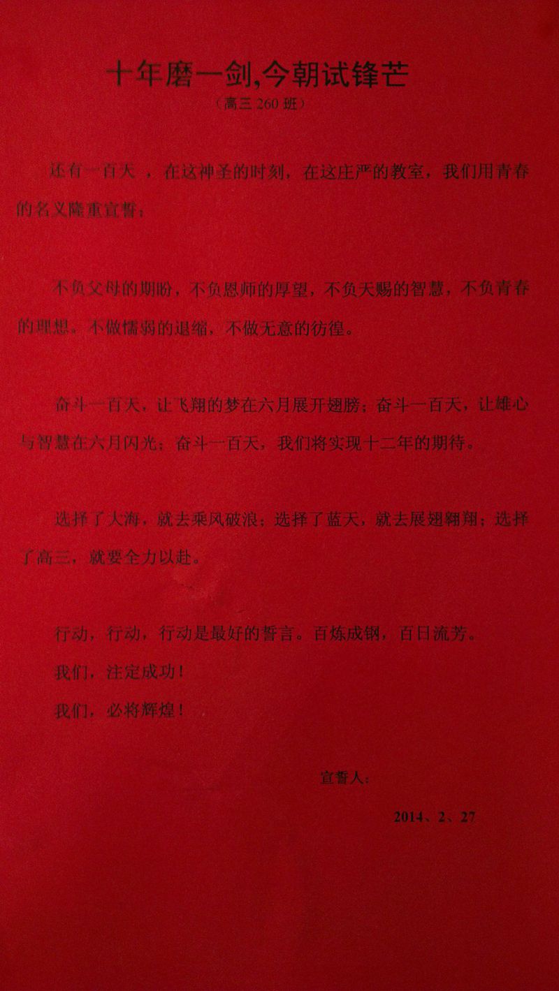 “十二年寒窗争分夺秒励志凌绝顶、一百日苦练你追我赶破浪展雄风”、“决胜高考,舍我其谁”。 全力以赴、共铸辉煌!