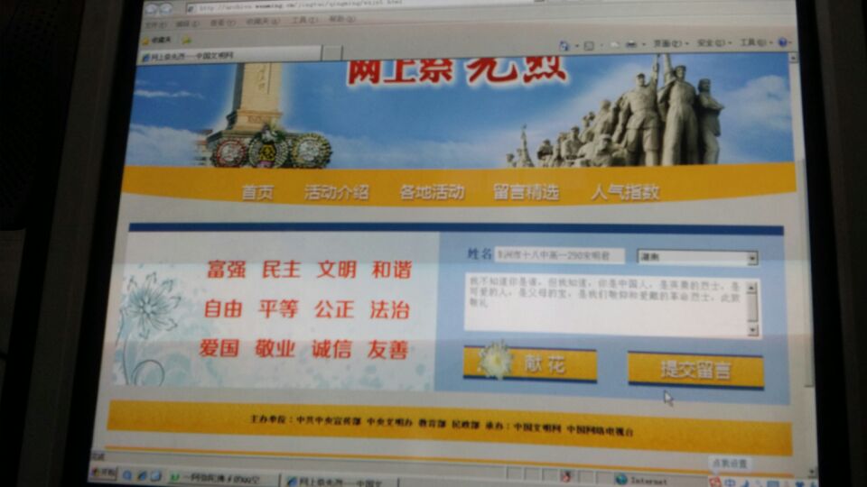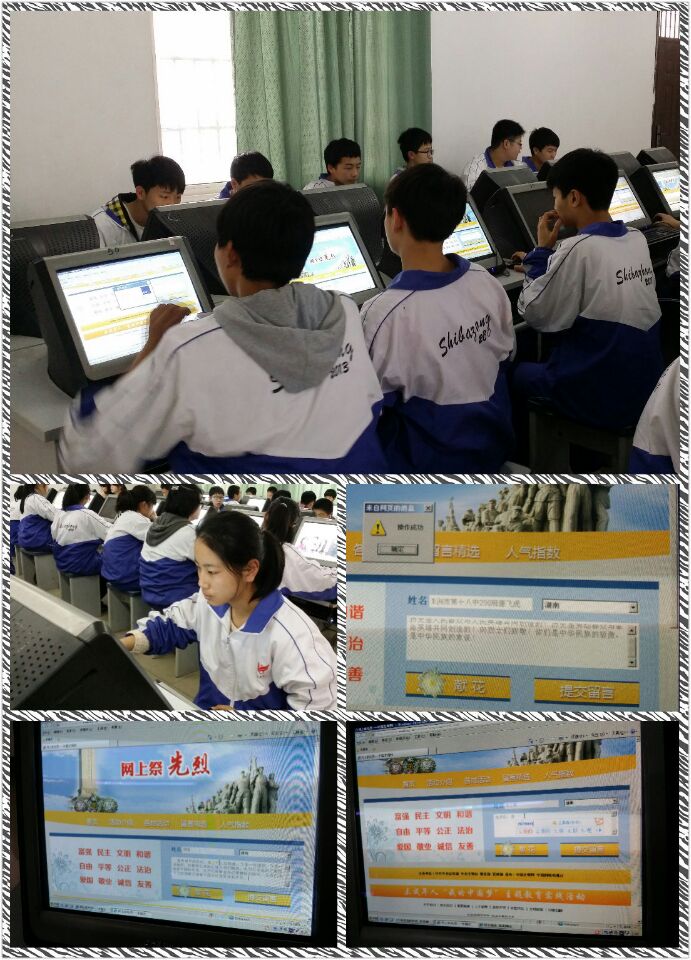 为进一步深化“做一个有道德的人”主题活动,十八中积极组织未成年人开展“网上祭英烈”签名寄语活动。通过组织未成年人了解民族传统文化、在网上向先贤先烈鞠躬献花、抒写感言寄语等活动,引导未成年人慎终追远、缅怀先辈,铭记革命先烈光荣事迹,倍加珍惜今天幸福生活。