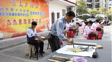 十八中邓德桂老师,在学生的古筝合奏《渔舟唱晚》的陪伴下,挥毫泼墨,短短几分钟,一幅《枇杷图》栩栩如生的呈现于观众眼前。荷塘区教研室也送来独舞《乱红》,以表达对社区老人节日的祝福。