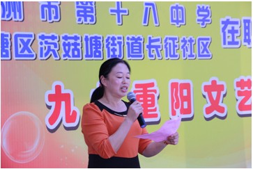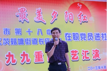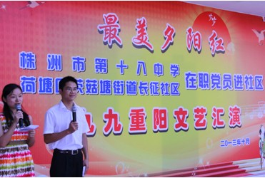 岁岁重阳,今又重阳。10月12日下午,株洲市十八中在职党员走进社区,联手荷塘区茨菇塘街道长征社区共同举办“最美夕阳红”重阳节文艺汇演活动。株洲市十八中李国柱校长、杨电波书记、荷塘区委组织部副部长汤灿等领导与百余名社区中老年朋友齐聚一堂,欢庆重阳佳节。