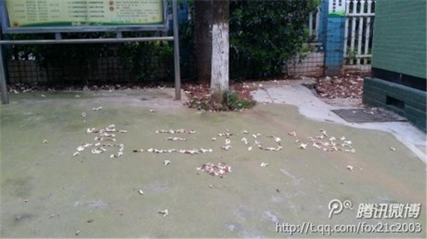 在劳动之余,可爱的高一学子们还不忘给奋战在高考、学考战线上的学长们加油。如281班的学生就极具创意地用落蕊拼出了“高三加油”的字样,感动了高三的师生。