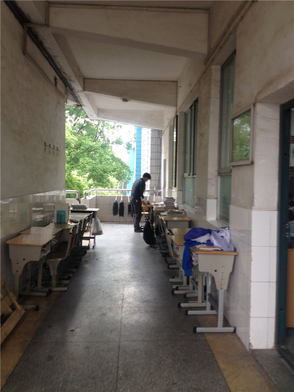 心细的级部长整理走廊桌椅